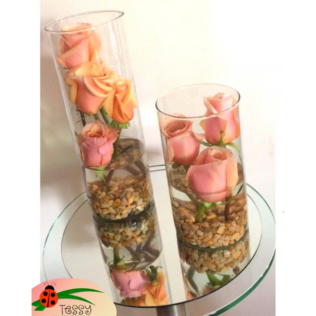Hermoso duo de floreros de vidrio sobre espejo con rosas rojas o tono pastel.