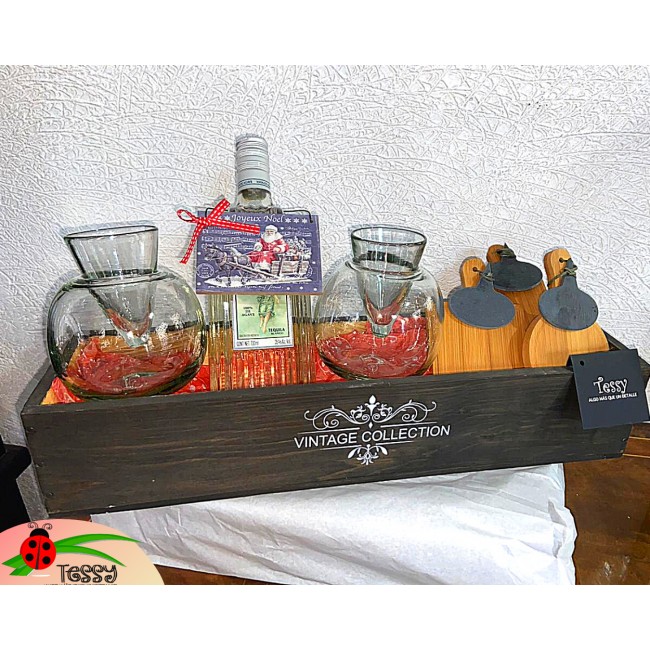 Juego de Tequileros en vidrio soplado, tequila y 3 bases para botana individual con letrero pizarrón